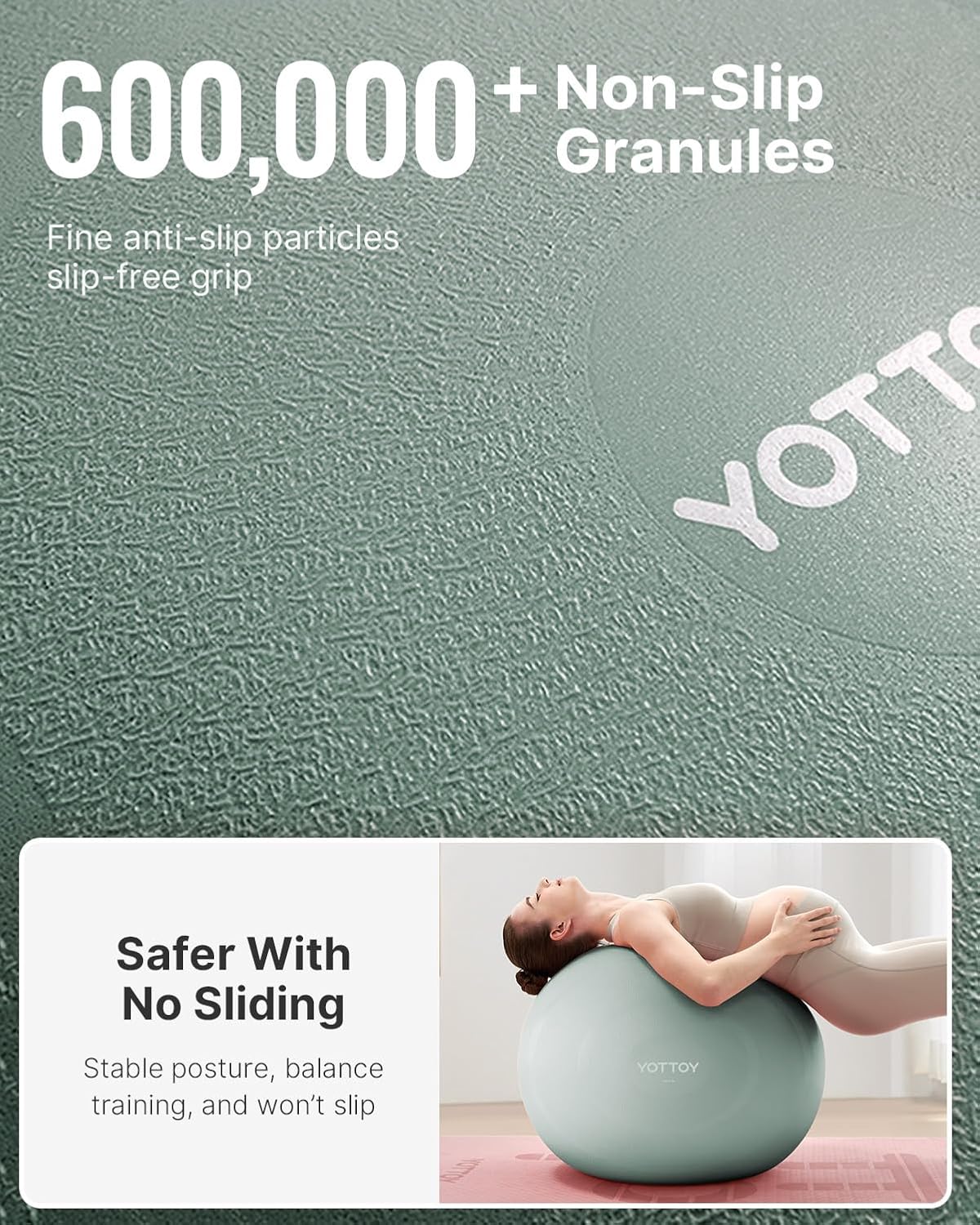 - Our workout balls for exercise features a surface design that is exclusive to our YOTTOY brand, incorporating an explosion-proof thread for double the strength and added durability. Additionally, we have improved the anti-slip texture to ensure a strong grip, even when sweating. With its sturdy construction, you can trust that our fit ball won't pop out during your workouts. Elevate your yoga practice today with our top-of-the-line sitting ball