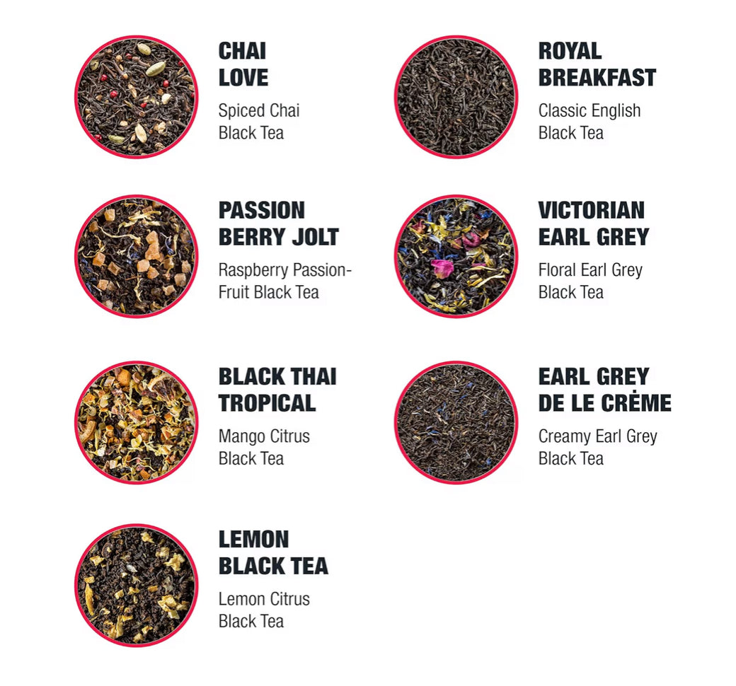 - SAVOR 7 DISTINCT TEA BLENDS: This sampler includes a curated mix of 7 flavorful black teas: Passion Berry Jolt, Black Thai Tropical, Chai Love, Earl Grey de la Creme, Lemon Black Tea, Royal Breakfast, and Victorian Earl Grey. Each blend delivers a unique profile, offering a delicious way to discover your next favorite brew. (Blends may vary for a fresh experience with every set.)