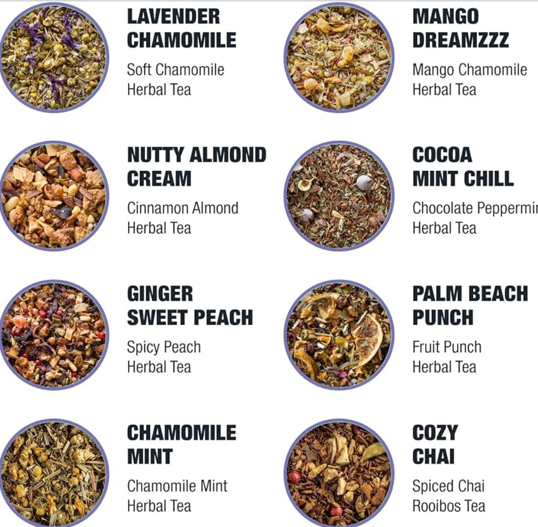 - SAVOR 8 DISTINCT TEA BLENDS: The set features 8 delightful blends, including Cocoa Mint Chill, Ginger Sweet Peach, Lavender Chamomile, Mango Dreamzzz, Nutty Almond Cream, Palm Beach Punch, Cozy Chai, and Chamomile Mint. Each blend provides a distinct taste experience, perfect for exploring new favorites. (Teas may vary for a fresh experience with every set.)