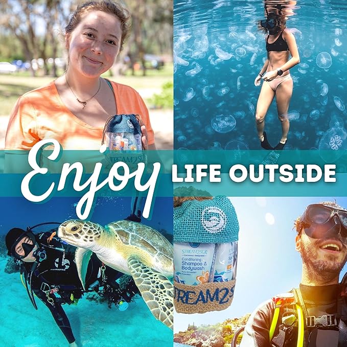 EcoConscious Travel Kit Body & Hair Care Gift Set | Shampoo & Body wash | Conditioner | SPF30, SPF20 and Mineral Sunscreen | SPF 30 Cucumber Mint and Hydrate Cherry Vanilla Lip Balm by Stream2Sea
