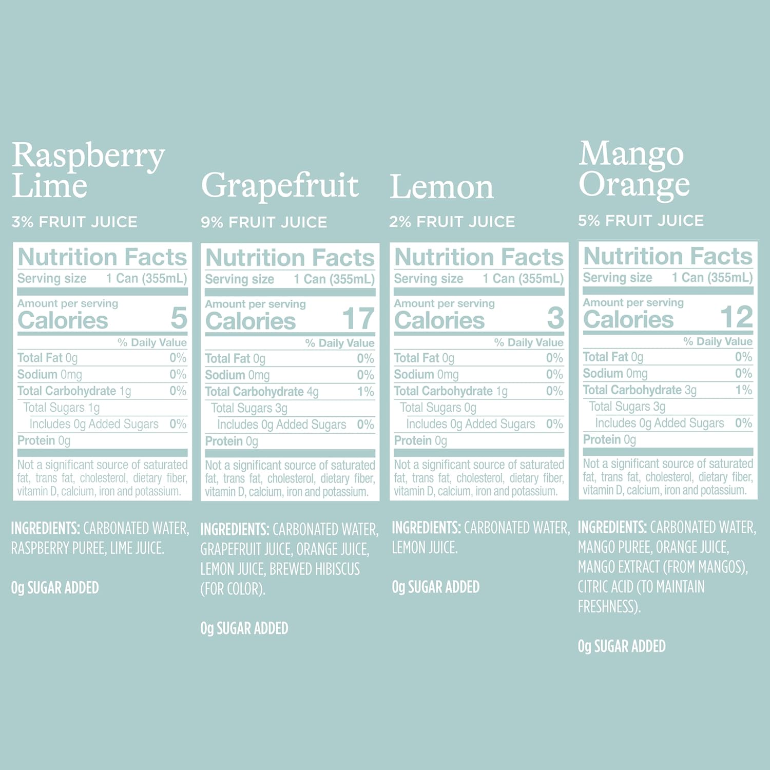 - Pack includes 20 sparkling water cans (12 fluid ounces per can): lemon (5 cans), grapefruit (5 cans), raspberry Lime (5 cans), and orange Mango (5 cans)