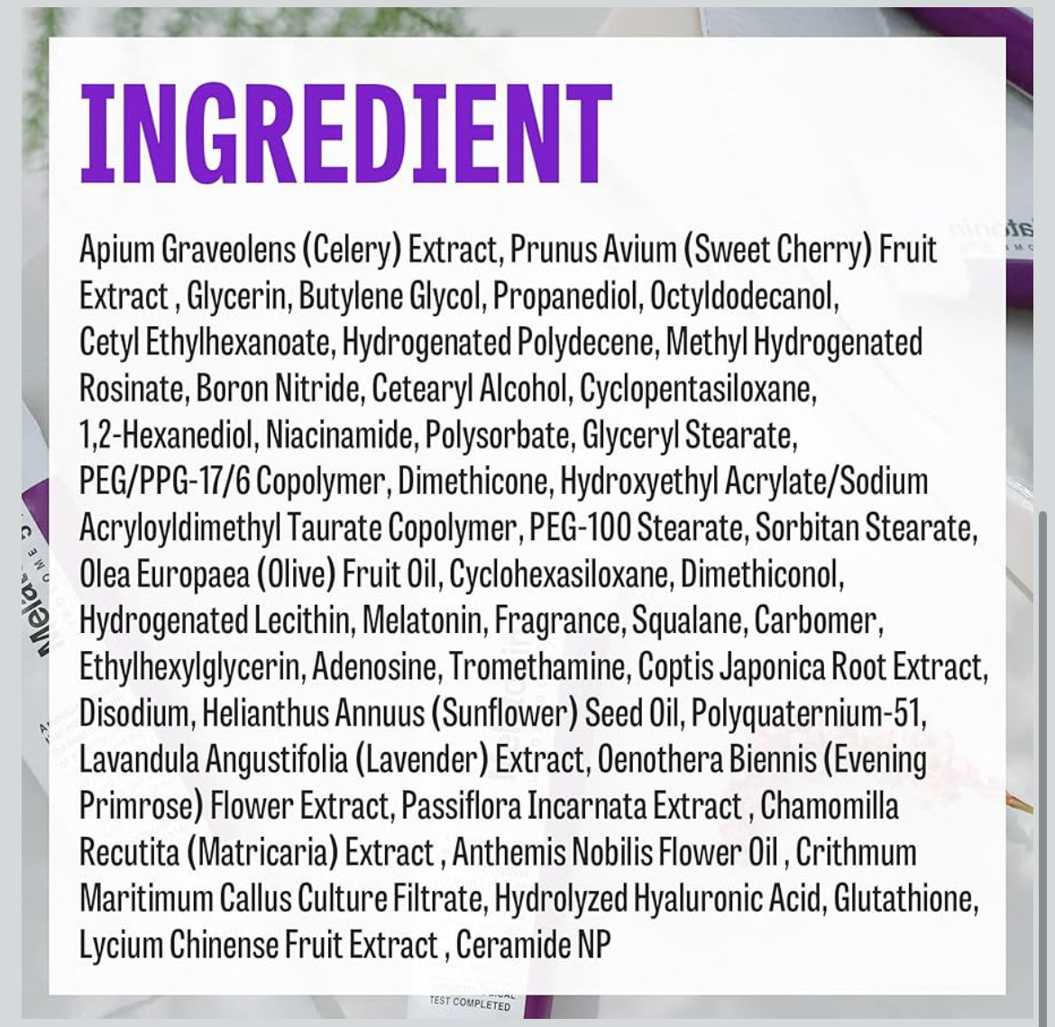 - RESILIENT & REVITALIZED SKIN. Infused with 50,000 ppm of Melatonin Liposomes and Adenosine, this facial moisturizer enhances skin elasticity and resilience which offers the same revitalizing benefits as a restful night's sleep, leading to a younger-looking and well-nourished complexion.