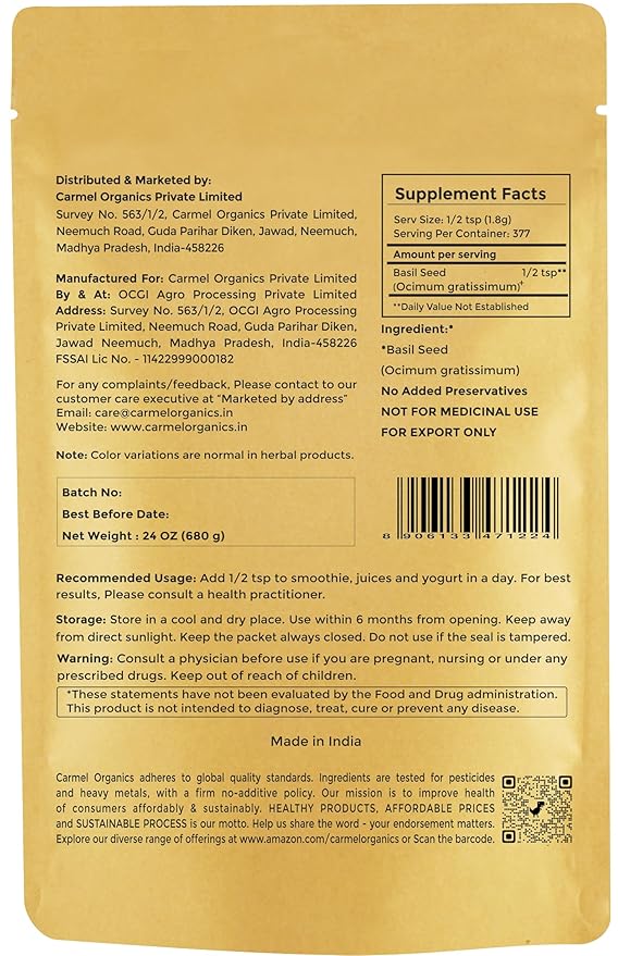 Edible Basil Seeds. | 24 Ounce or 1.5 Lb/680 grams | Tukmaria Sabja Seeds| Rich in Fibers | Add to Smoothies | Non GMO | Keto + non Gluten | Natural | By Carmel Organics