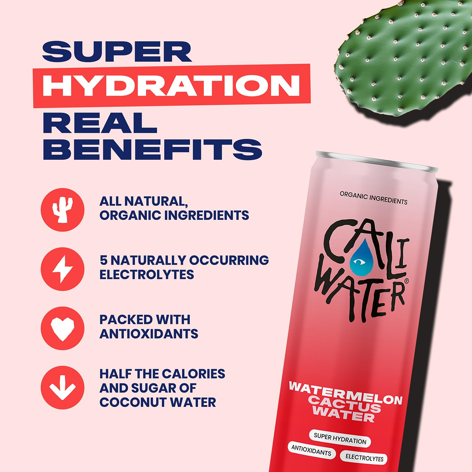 Caliwater - Organic Cactus Water - Watermelon - 5g Sugar, 35 Calories - Half Sugar of Coconut Water - Natural Plant Based Hydration - Skin Care, Electrolyte Drinks - Flavored Water Beverages - 12 Cans
