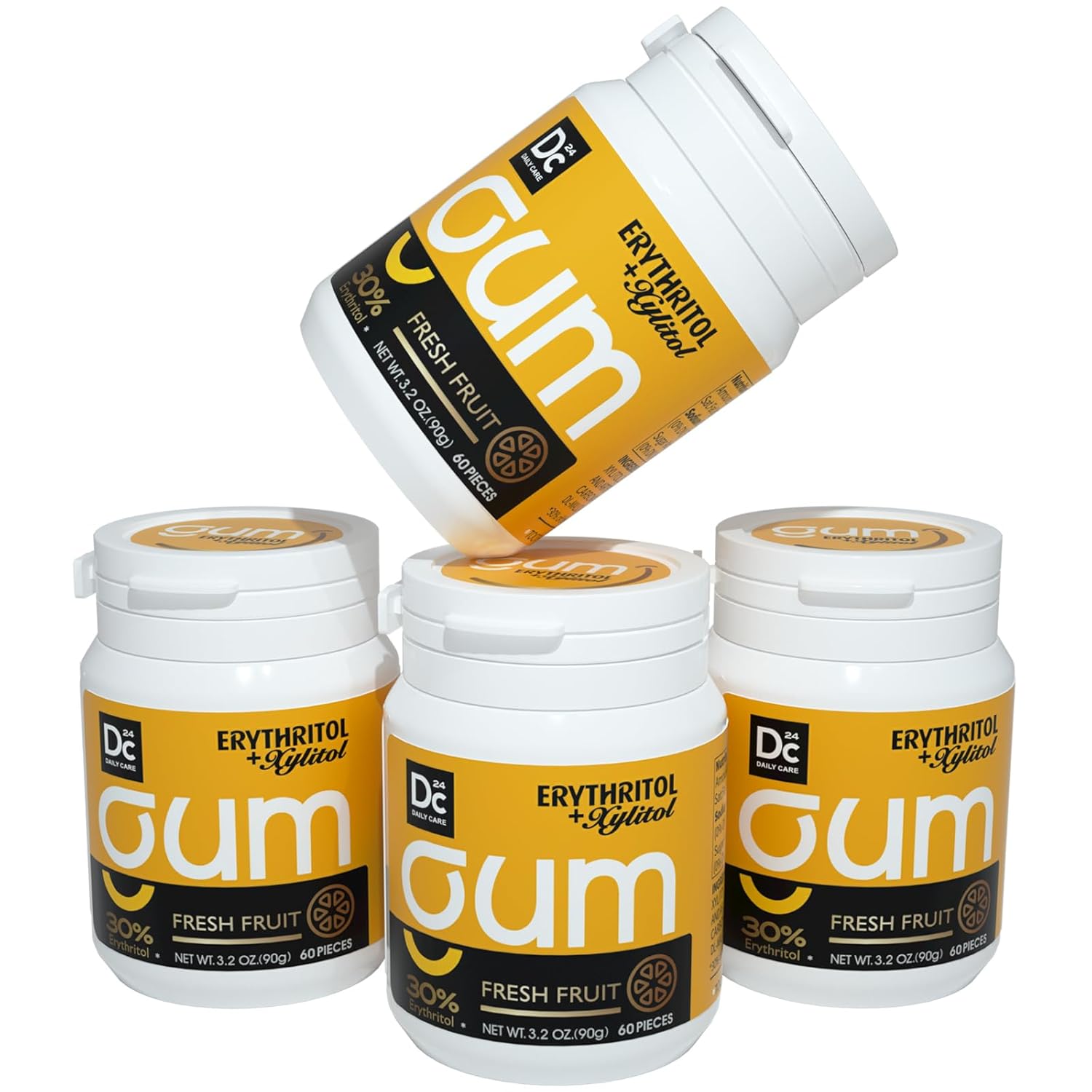 DC24 DAILY CARE Xylitol Gum, Aspartame Free & Sugar Free Chewing Gum for Dry Mouth, Low-Calorie with Erythritol, Sugarless, Fresh Fruit Flavor, 60-Piece Pack, 4 Packs