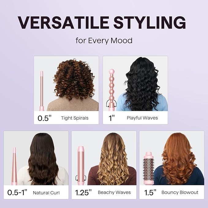 - Curling wand with different size can make different hairstyles:The sizes of Wavytalk 5 in 1 curling wands are 1 inch bubble barrel curling wand ;0.5 inch small curling wand; 0.5-1inch tapered barrel curling wand ; 1.25 inch curling wand; 1.49inch curling brush