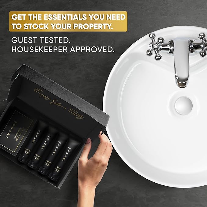Infuse Black Amenity Kit | Boxed Hotel Toiletries | Bulk Set 1 oz Travel Size Shampoo, Conditioner, Lotion, Body Wash & Cleansing Bar for Guest Hospitality AirBnB/Vacation Rentals | 1 set per case
