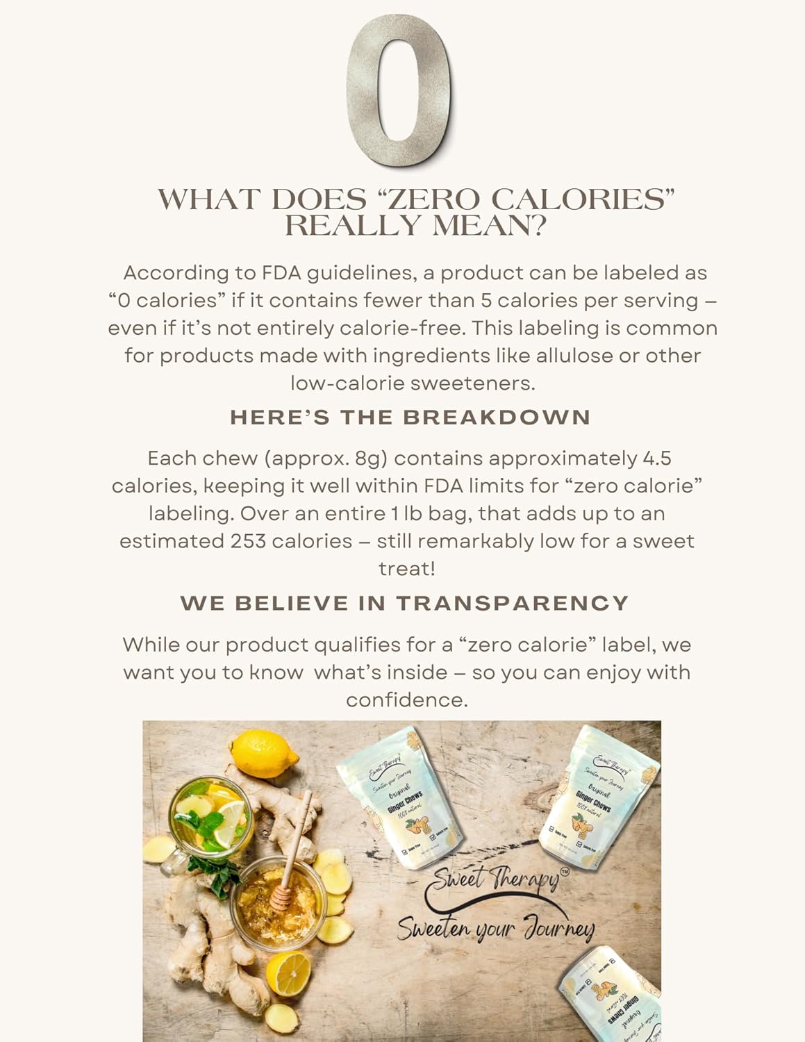 - Sugar free/ Calorie free: Sweet Therapy Delicious Sugar Free Ginger Chews provide a healthy candy-Calorie free snacks option to take as a travel candy and great healthy snacks.