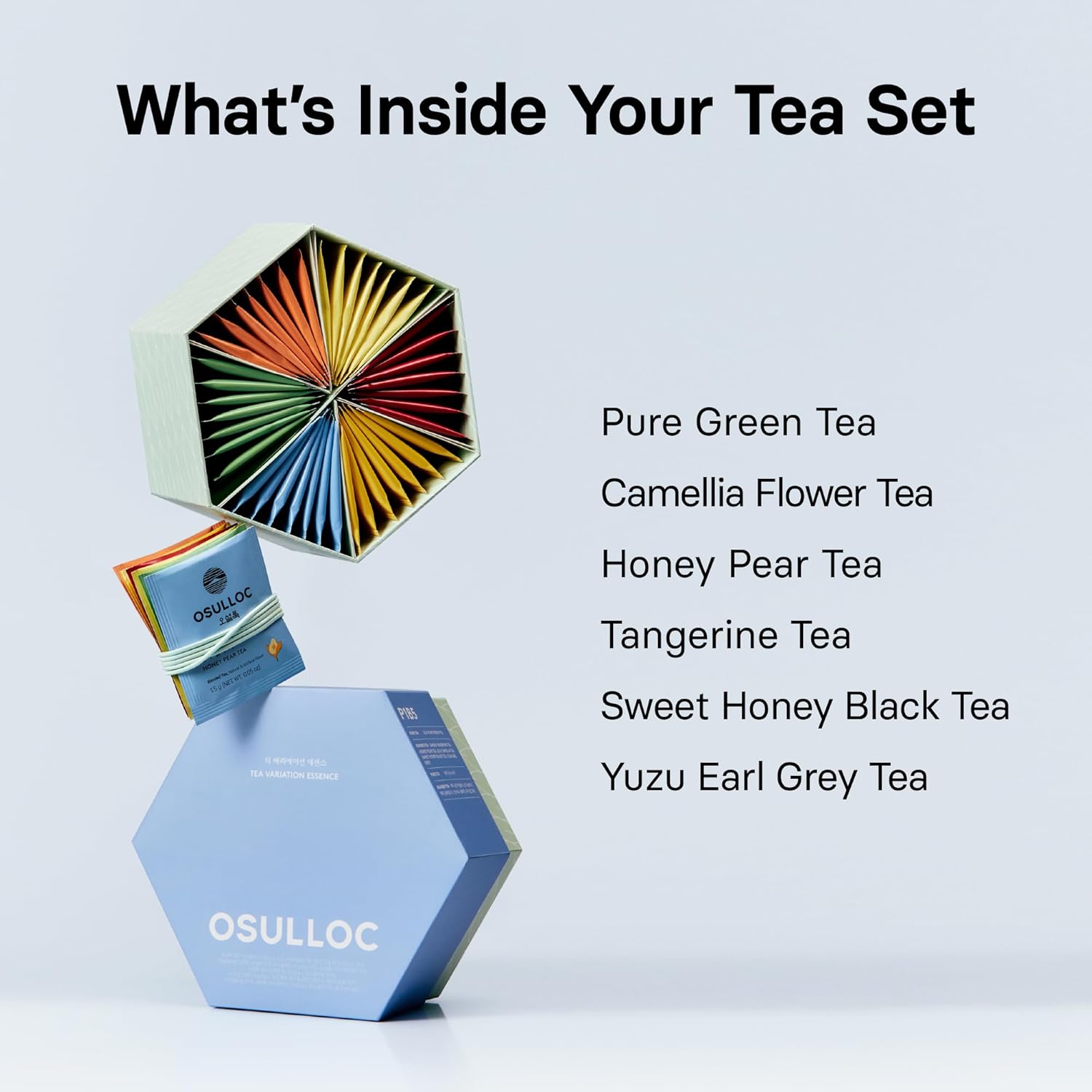- [Alluring Variety for Daily Delight] Discover a new favorite every day with OSULLOC's VARIATION ESSENCE tea set, consisting of 6 distinct flavors. Savor the diversity of Korea's finest teas with each meticulously curated tea bag, ensuring a unique and refreshing experience with every cup. Containing pure organic green tea, Beloving black tea, and aromatic blended tea.