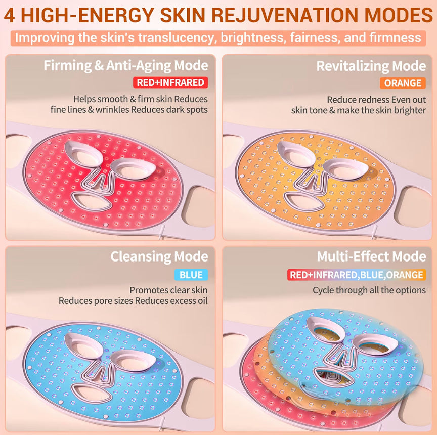 - 4 Wavelength Technology Including Infrared 850nm: Our led face mask light therapy offers 4 distinct modes—Infrared (850nm) & Red Light (630nm), Orange Light (600nm), Blue Light (460nm), and a 4-Color Cycle Therapy. Infrared & Red Light smooth the skin, enhance elasticity, and firm the face; Orange Light reduces pigmentation and soothes redness; Blue Light balances oil production for healthier, clearer skin