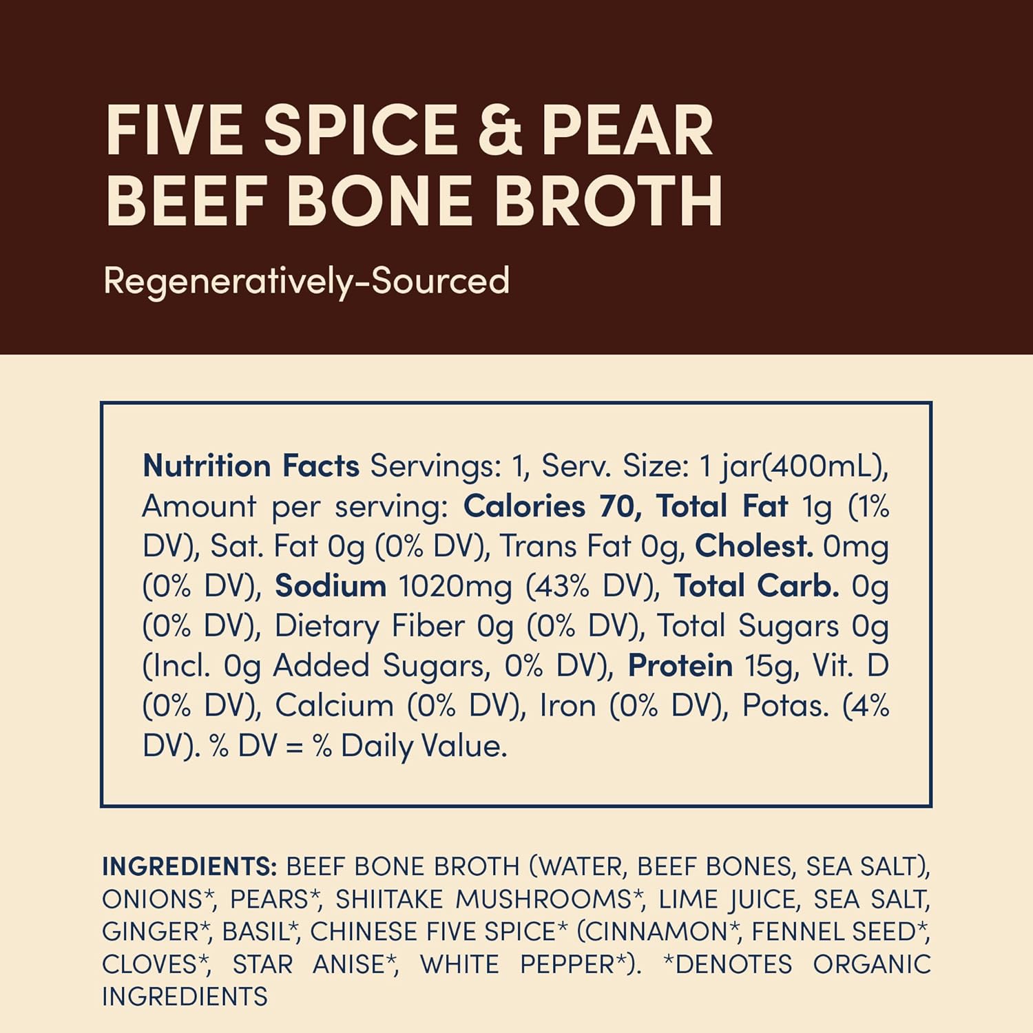 TOMATO & THYME INGREDIENTS: BEEF BONE BROTH (WATER, BEEF BONES, SEA SALT), *CARROTS, *LEMON JUICE, *CELERY, *SHALLOTS, *TOMATO SAUCE, *SCALLIONS, *GARLIC, SEA SALT, *THYME. *DENOTES ORGANIC INGREDIENT GINGER & CAYENNE INGREDIENTS: BEEF BONE BROTH (WATER, BEEF BONES, SEA SALT), *CARROTS, *LEMON JUICE, *CELERY, *SHALLOTS, *TOMATO SAUCE, *SCALLIONS, *GARLIC, SEA SALT, *THYME. *DENOTES ORGANIC INGREDIENT FIVE SPICE & PEAR INGREDIENTS: BEEF BONE BROTH (WATER, BEEF BONES, SEA SALT), *ONIONS, *PEARS, *SHIITAKE MUSHROOMS, LIME JUICE, SEA SALT, *GINGER, *BASIL, *FIVE SPICE. *DENOTES ORGANIC INGREDIENTS