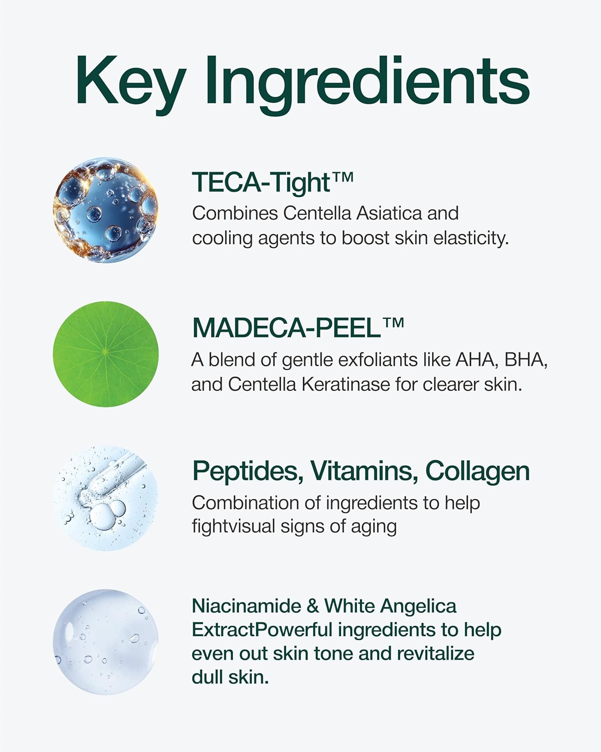 - GENTLE EXFOLIATION - Provides non-irritating exfoliation with MADECA-PEEl, a blend of AHA, BHA, and Centella Keratinase, to clear away impurities and excess oil, revealing a luminous and more even skin tone after every use.