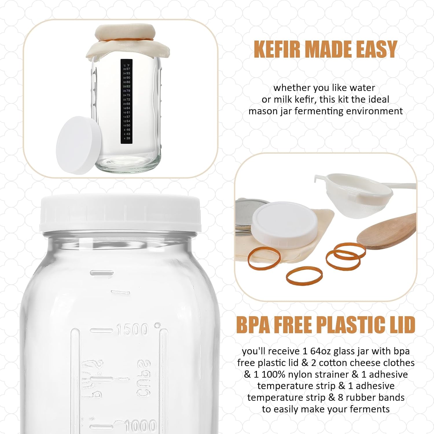 - Package Includes: you will receive 1 x 64oz wide mouth mason jar, 1 x 86 wide mouth white plastic lid, 2 x cheese cloth, 1 x plastic strainer, 1 x thermometer patch, 1 x long handle stirring spoon, 8 x tensile rubber bands, This kefir starter kit contains everything you need to start making kefir at home