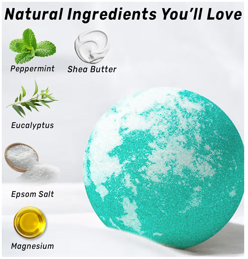 - CALMING BATH BOMBS: Immerse yourself in absolute indulgence with our peppermint bath bomb. let their captivating fragrances transport you to a serene haven of well-being. additionally, our invigorating aromatherapy bath bomb provides relief from muscle soreness and post-workout tension, enhancing your spa experience.